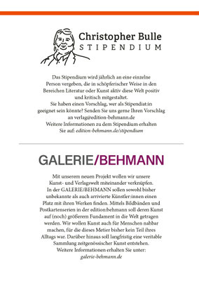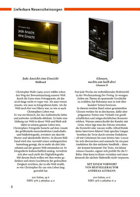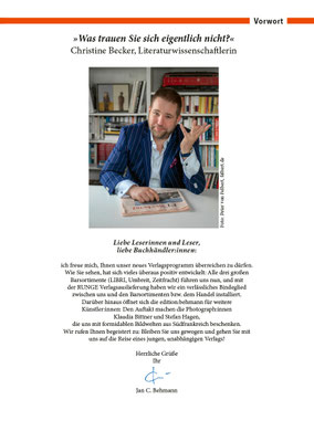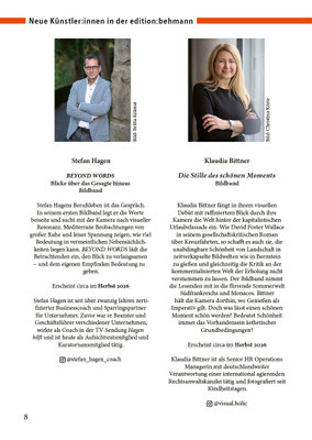 Wir freuen uns, Ihnen unser neues Verlagsprogramm vorstellen zu dürfen - mit einer zentralen Neuerung: die edition:behmann öffnet sich für weitere Künstler:innen. Den Anfang machen die Photograph:innen Klaudia Bittner und Stefan Hagen mit ihren Bildband-Debüts.